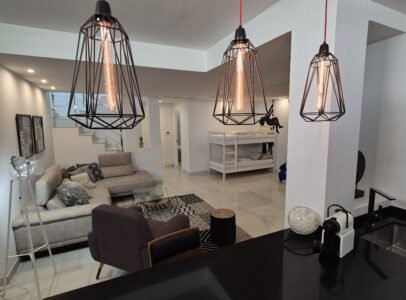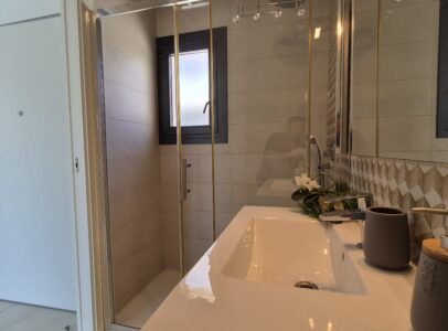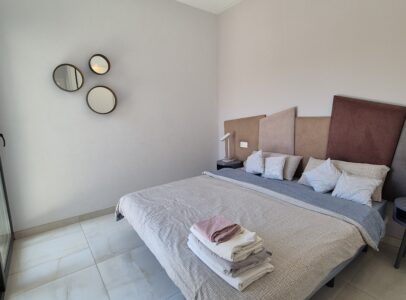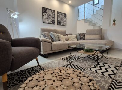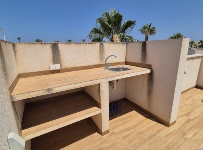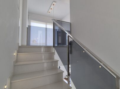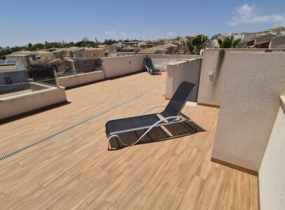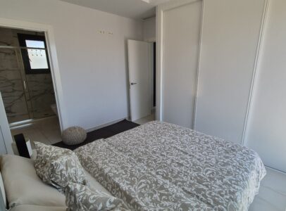 This property consists of on ground floor, large living and dining area, kitchen, 1 bedroom and 1 bathroom. On the upper flor there is another 2 bedrooms each with a en-suite bath room, stairs which take you to the roof terrace from where there is sea view.