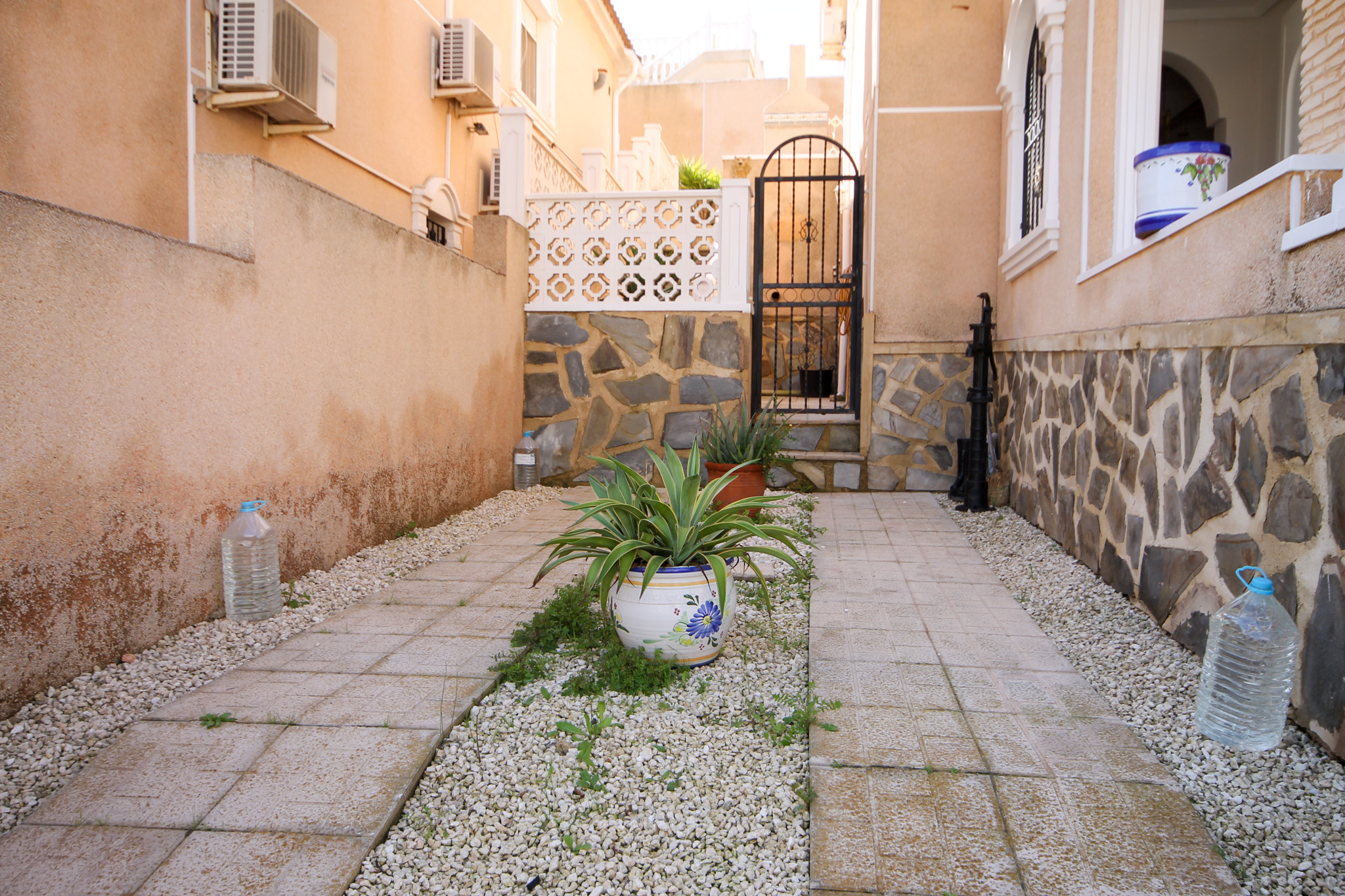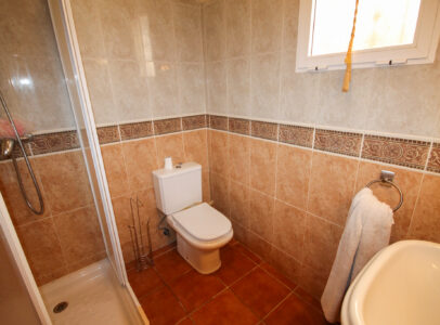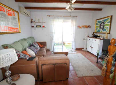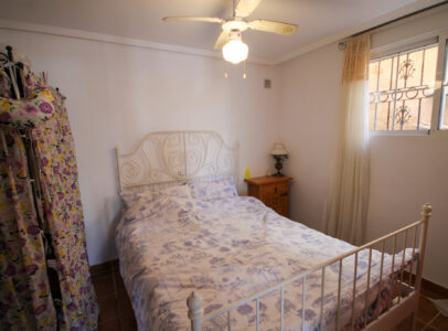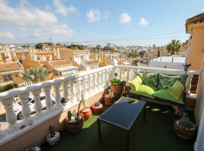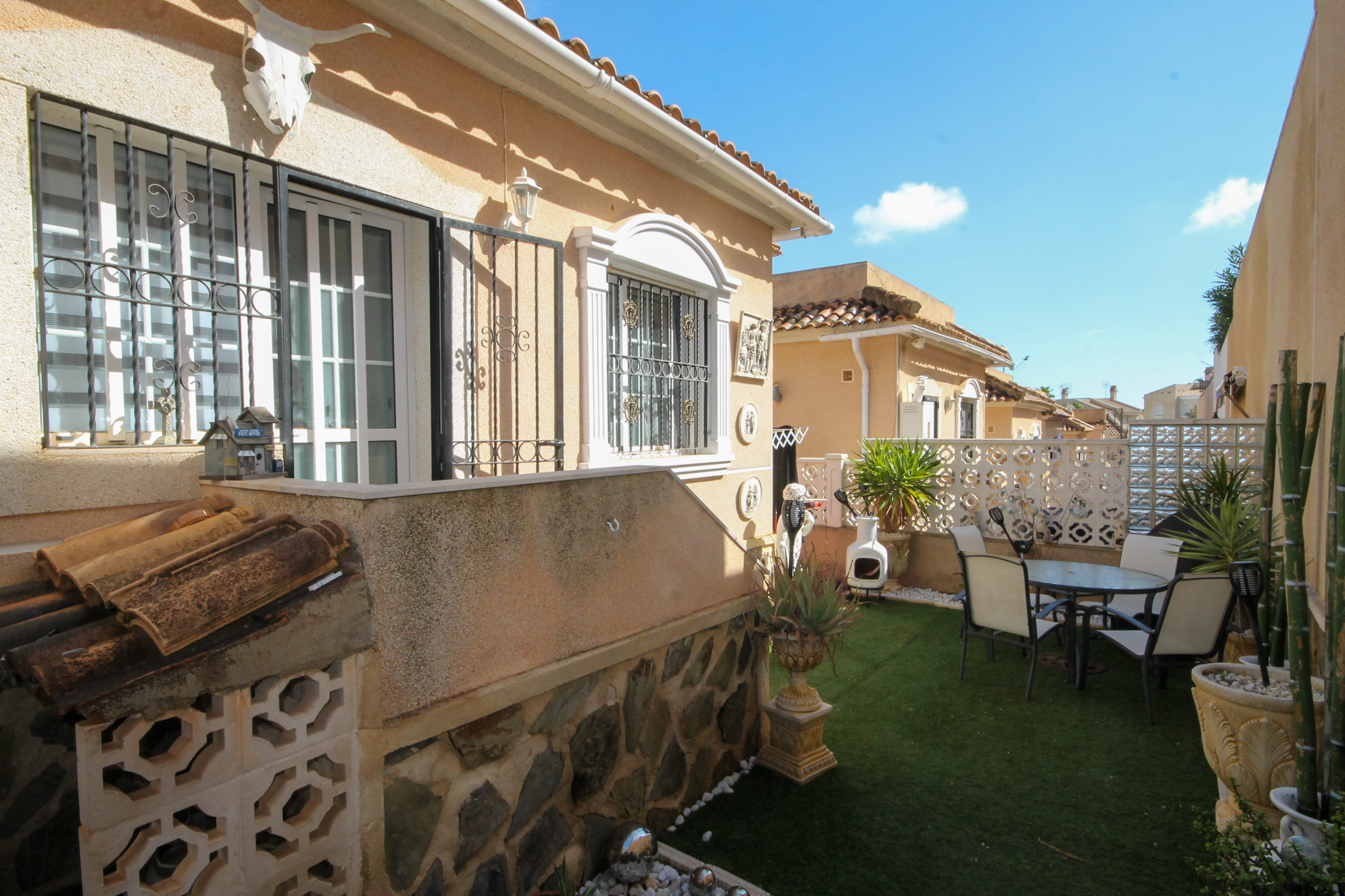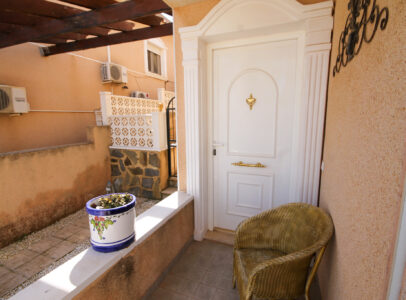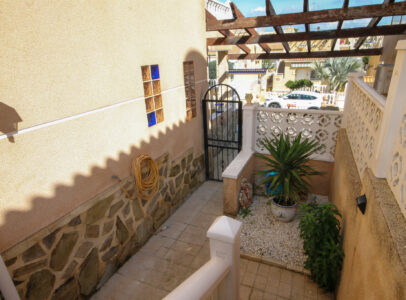 On entering the villa there is a wide hallway leading to a shower room and two double bedrooms. Stairs lead up to a good size lounge diner with patio doors onto a balcony with views of the urbanisation. Off the lounge is the master bedroom and a bathroom. Also, to the rear of the villa is a separate kitchen with a door accessing a garden. The garden is low maintenance with artificial grass, a shower to cool off in and a seating area. To the side is a stone barbeque and access to the utility room which as well as housing the washing machine has plenty of storage space too. The villa also benefits from air conditioning, electric radiators, sun awning and has off road parking. It is close to amenities including the fabulous Greenlands Mini Golf and the adjacent pool and kiosk bar. Two main commercial areas are also close by with Villamartin Plaza and La Fuente while the beaches are only 10 minutes drive away. No Community fee. Suma: 300.22€
