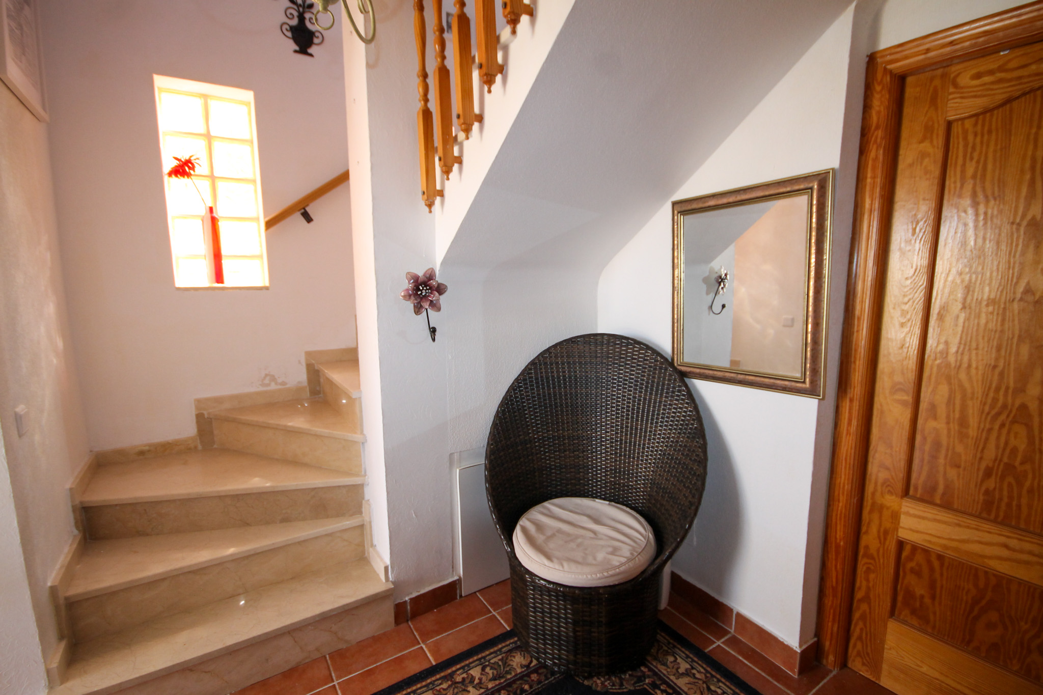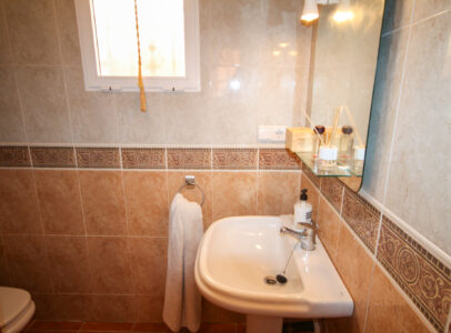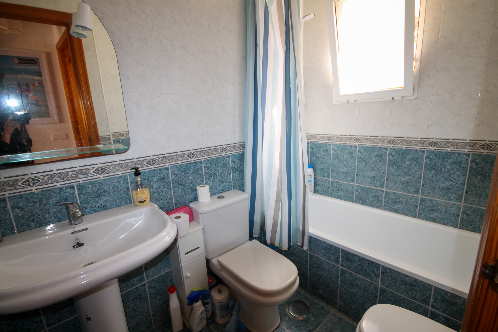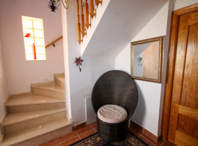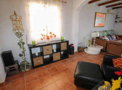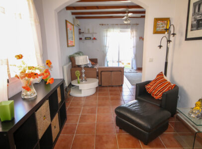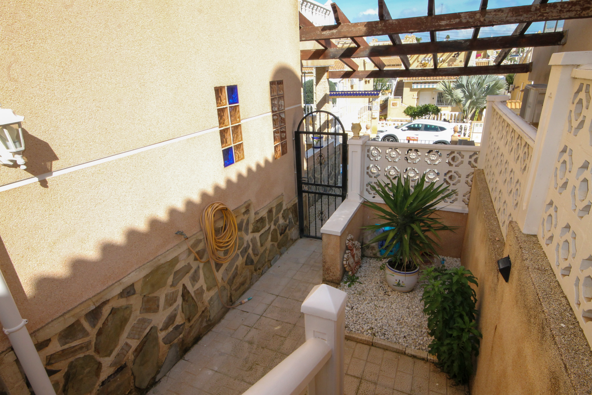 On entering the villa there is a wide hallway leading to a shower room and two double bedrooms. Stairs lead up to a good size lounge diner with patio doors onto a balcony with views of the urbanisation. Off the lounge is the master bedroom and a bathroom. Also, to the rear of the villa is a separate kitchen with a door accessing a garden. The garden is low maintenance with artificial grass, a shower to cool off in and a seating area. To the side is a stone barbeque and access to the utility room which as well as housing the washing machine has plenty of storage space too. The villa also benefits from air conditioning, electric radiators, sun awning and has off road parking. It is close to amenities including the fabulous Greenlands Mini Golf and the adjacent pool and kiosk bar. Two main commercial areas are also close by with Villamartin Plaza and La Fuente while the beaches are only 10 minutes drive away. No Community fee. Suma: 300.22€