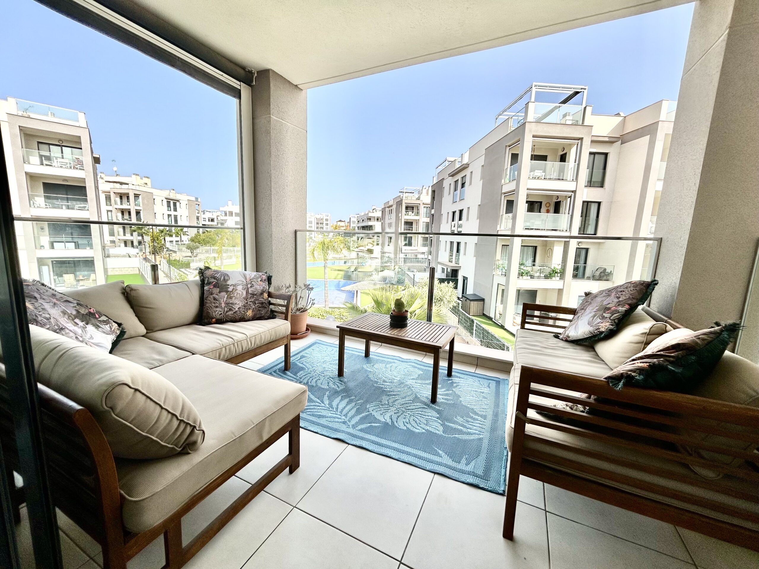 This modern home offers a bright and airy open-plan layout, designed to maximize natural light and create a seamless flow throughout the living spaces. The spacious lounge opens onto a private balcony, where you can unwind while enjoying picturesque views over the lush communal gardens and sparkling pools—perfect for soaking up the relaxed Costa Blanca lifestyle.