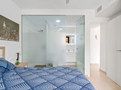 The bungalow offers two bedrooms and two bathrooms and features a practical layout with an open living area and kitchen that creates a pleasant sense of space and comfort. From the living area you have access to the terrace and the garden at the front of the property, a lovely place to relax and enjoy the Mediterranean climate.