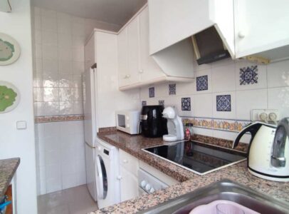 The interior has a spacious living and dining area complemented by a fully equipped kitchen. The ground floor accommodates two double bedrooms with fitted wardrobes, accompanied by a bathroom featuring shower facilities. The upper level hosts an additional double bedroom with direct access to an expansive roof terrace and another bathroom with a shower.