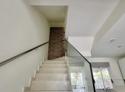 The ground floor includes a bright living area with underfloor heating, a fully equipped kitchen, and a bedroom with a separate bathroom. Upstairs are two spacious bedrooms, each with its own en-suite bathroom, plus a glass-enclosed terrace with sea views.