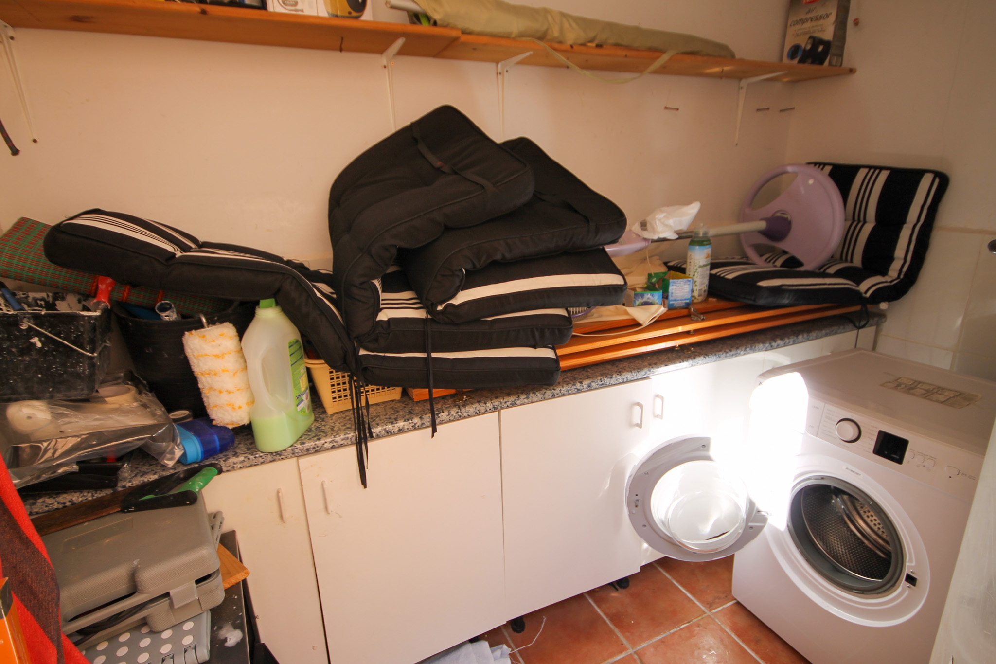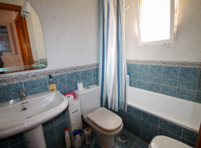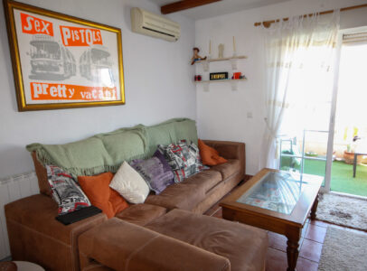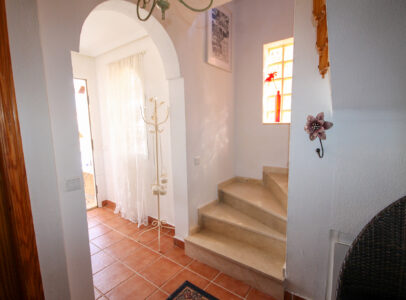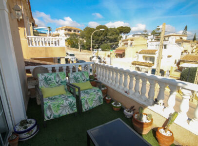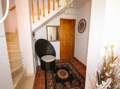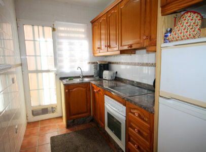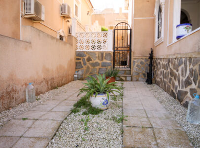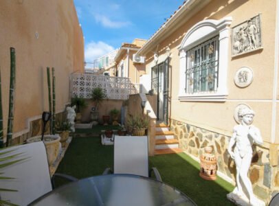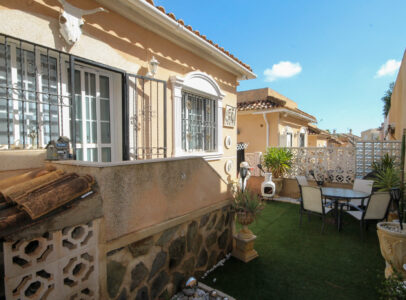 On entering the villa there is a wide hallway leading to a shower room and two double bedrooms. Stairs lead up to a good size lounge diner with patio doors onto a balcony with views of the urbanisation. Off the lounge is the master bedroom and a bathroom. Also, to the rear of the villa is a separate kitchen with a door accessing a garden. The garden is low maintenance with artificial grass, a shower to cool off in and a seating area. To the side is a stone barbeque and access to the utility room which as well as housing the washing machine has plenty of storage space too. The villa also benefits from air conditioning, electric radiators, sun awning and has off road parking. It is close to amenities including the fabulous Greenlands Mini Golf and the adjacent pool and kiosk bar. Two main commercial areas are also close by with Villamartin Plaza and La Fuente while the beaches are only 10 minutes drive away. No Community fee. Suma: 300.22€