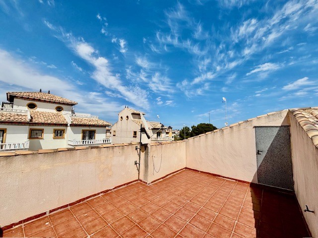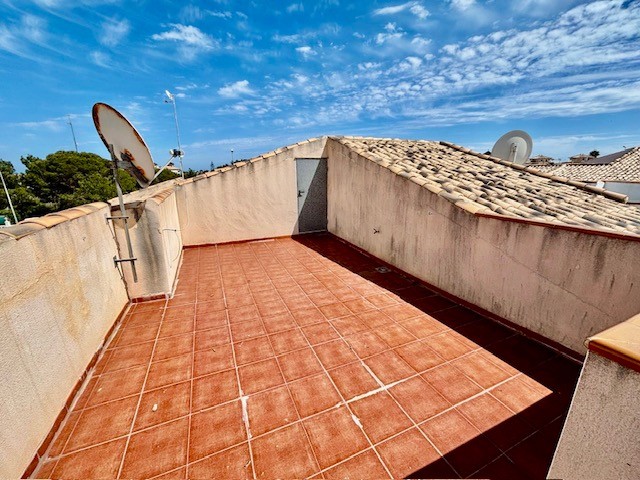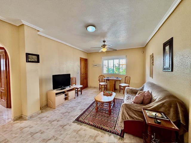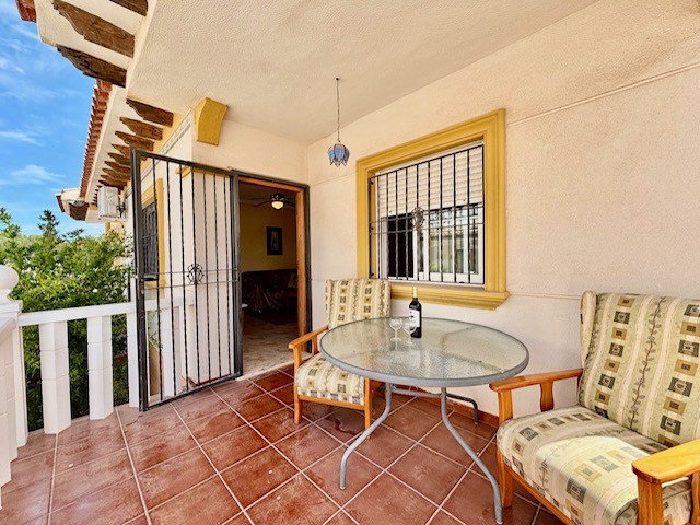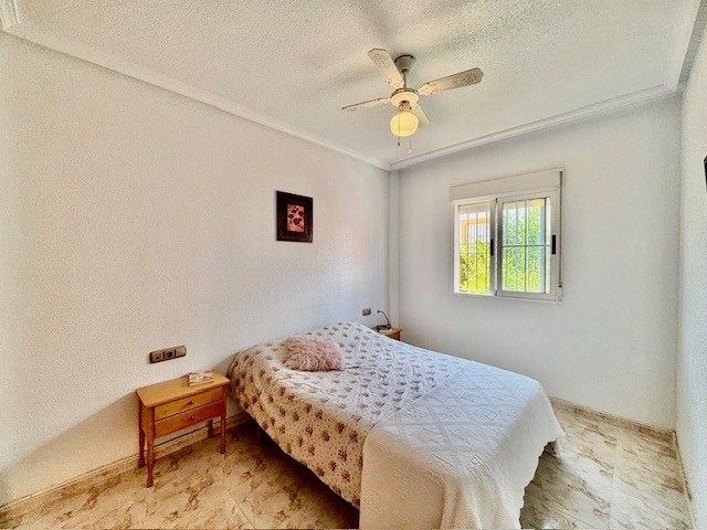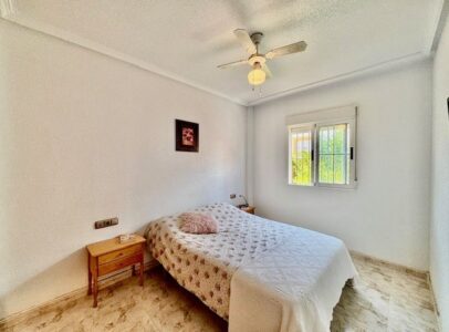 Great One Level Quad fully furnished property in a peaceful location. This lovely bungalow has a patio garden and breakfast terrace to enjoy as well as a well maintained community pool and gardens. Just a 10 minutes walk to local shops, bars and restruants. Less than a 5 minutes drive to the beautiful cove beaches of Cabo Roig or to the buzzy strip, full of nightlife. Only a few minutes drive to the golf course.