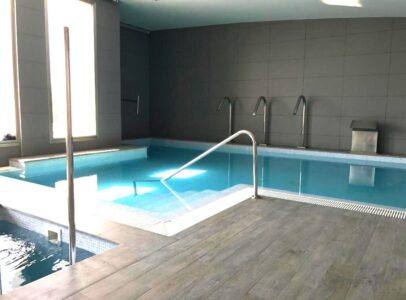 The residential complex offers excellent communal facilities, including an outdoor swimming pool surrounded by green areas, an indoor heated pool for year-round enjoyment, a fully equipped gym, a sauna, and a wellness area for relaxation.