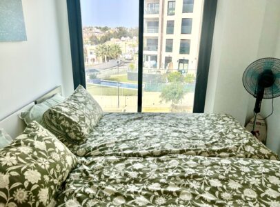 This modern home offers a bright and airy open-plan layout, designed to maximize natural light and create a seamless flow throughout the living spaces. The spacious lounge opens onto a private balcony, where you can unwind while enjoying picturesque views over the lush communal gardens and sparkling pools—perfect for soaking up the relaxed Costa Blanca lifestyle.