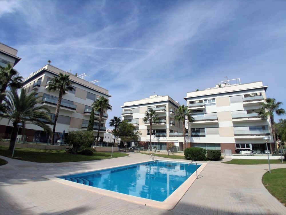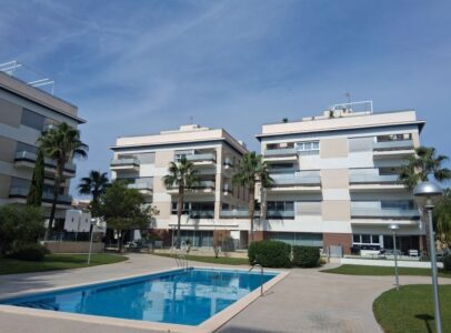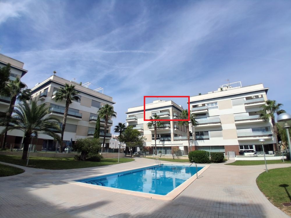 This is a third-floor penthouse with elevator access. Entrance hall, double bedroom with ensuite bathroom, very spacious double bedroom, full bathroom, large living room with open-plan French kitchen and direct access to a terrace with views of the pool and the sea.