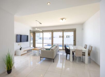 the property offers both privacy and generous outdoor living space. The exterior boasts a spacious garden with multiple seating areas, a private swimming pool, and off-road parking. A standout feature is the expansive rooftop solarium—perfect for entertaining while enjoying panoramic views of the surrounding area. Inside, the villa features a bright and modern open-plan living space with a large, well-appointed kitchen. There are three generously sized double bedrooms, including 2 master bedrooms with en-suite bathroom, as well as a separate family bathroom.—making it an ideal choice for a permanent residence, holiday home, or investment opportunity.