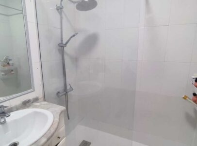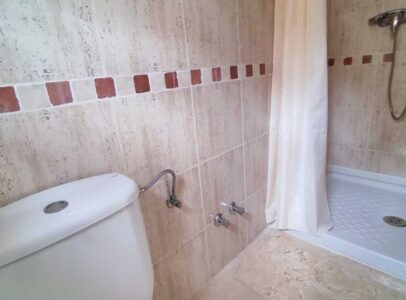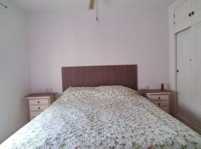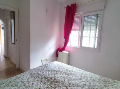 The interior has a spacious living and dining area complemented by a fully equipped kitchen. The ground floor accommodates two double bedrooms with fitted wardrobes, accompanied by a bathroom featuring shower facilities. The upper level hosts an additional double bedroom with direct access to an expansive roof terrace and another bathroom with a shower.