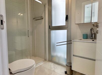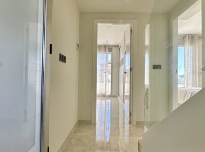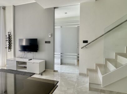The ground floor includes a bright living area with underfloor heating, a fully equipped kitchen, and a bedroom with a separate bathroom. Upstairs are two spacious bedrooms, each with its own en-suite bathroom, plus a glass-enclosed terrace with sea views.